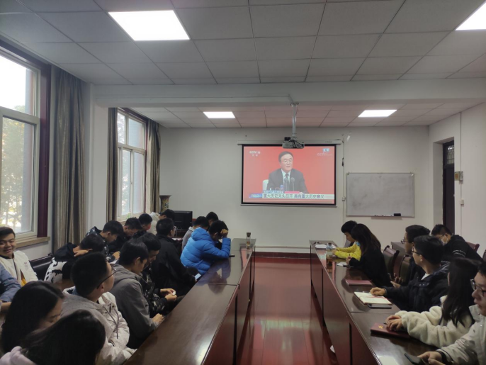 本科生党员和部分教师在骊山校园学院会议室收看新闻发布会