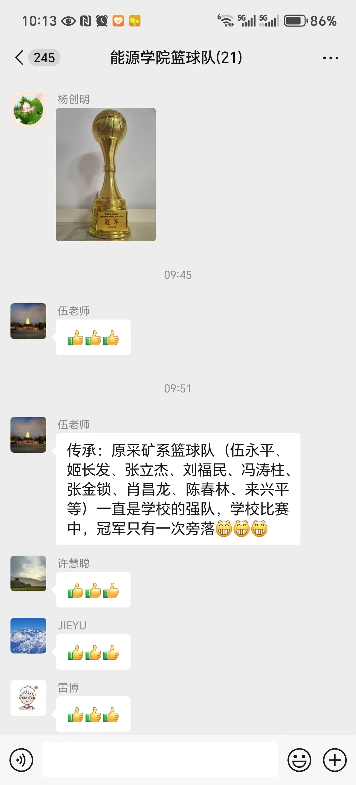 据悉,以伍永平、姬长发、张立杰、刘福民、冯涛柱、张金锁、肖昌龙、陈春林、来兴平等为主力的原采矿工程系篮球队一直是学校篮球赛场的强队,一直包揽着校级篮球比赛的“冠军”。