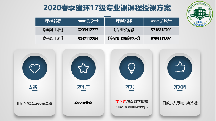 本学期建环专业17级有《空调工程》、《通风工程》、《空气调节用制冷技术》、《专业外语》等多门课程,针对专业课程多的特点,建环17级授课的老师们组建了互助教学团队,为了减轻学生们的负担,统一了学习平台,同时为了防止授课期间网络拥堵的情况,制定了四种方案,为下周的网络授课奠定了一定的基础。