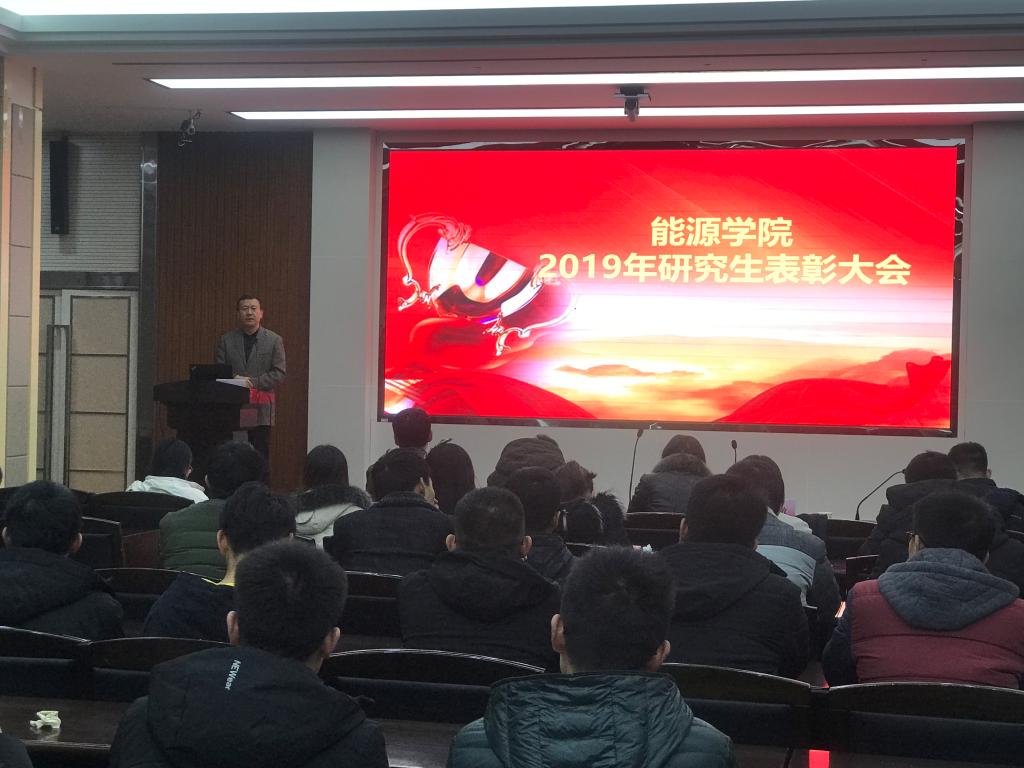 赵兵朝发表讲话,对过去一年学院取得的奖项作了简单总结,大会对在互联网+、成果创新展等省部级及以上学科竞赛中获奖的5项研究生作品(24人次)进行了表彰,院系领导为获奖学生颁发了荣誉证书。他呼吁全体博硕士以获奖同学为榜样,积极参加各种竞赛,为能源学院的发展增光添彩。