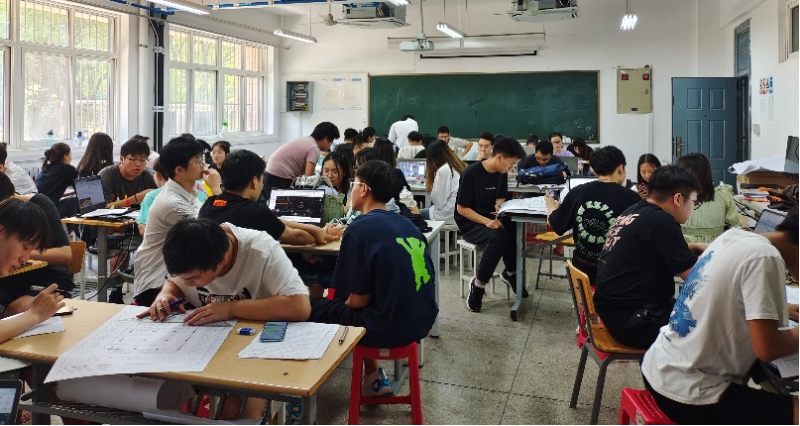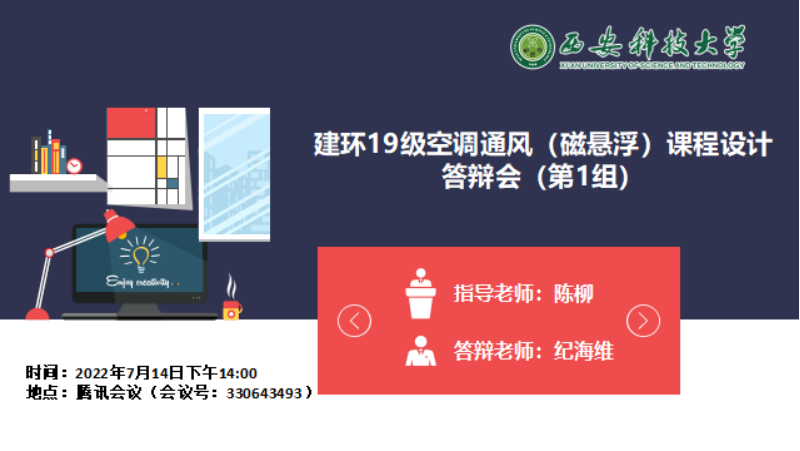 在课设初期结合学生学习能力,保证每人一题的课设题目,针对部分学习能力比较强的学生,给出设计参赛题目,累计有30名学生们报名,组成5个参赛小组,在完成课设的同时进行创新型设计,并在8月份参加海尔”磁悬浮”绿色节能大赛。前两周要求学生每天8点进教室,指导教师全天线下指导。后三周因为疫情,采用线上教学环节。每天通过雨课堂给学生发放当天的任务,进行线上指导外,学生必须在当天晚上8点将设计通过雨课堂提交,教师完成统计和批阅。为保证设计能落地,除了指导教师外,还邀请毕业的优秀校友及设计院设计师进行线上指导和讲座。最后每个学生还要进行15-20分钟的课程设计答辩。最终结合平时成绩,指导成绩、答辩成绩综合给分。
