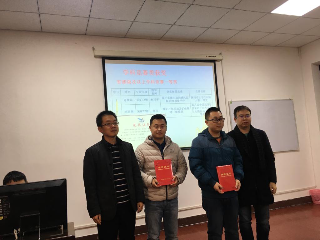 会上,赵兵朝宣读了2018年度能源学院研究生在学科竞赛方面获得省部级及以上奖励名单。大会对在大学生创业大赛、研究生电子设计竞赛、研究生数学建模竞赛等省部级及以上学科竞赛中获奖的12项研究生作品(35人次)进行了表彰。院系负责人为获奖研究生颁发了获奖证书。