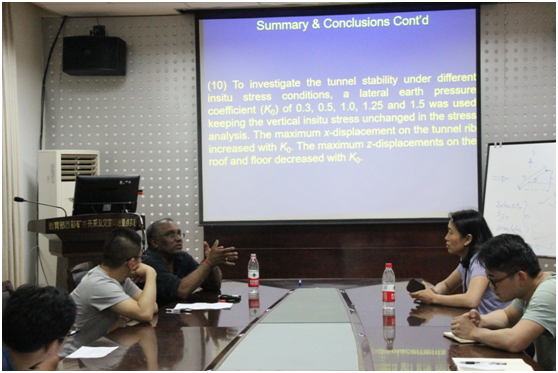 报告会后,Pinnaduwa H.S.W.kulatilake教授与师生进行了互动,回答了师生感兴趣的科学问题,与师生共同分享了亚利桑那大学的一些状况。内容新颖、生动,富有启发的报告使师生深刻地认识到岩体模拟和计算岩石力学的强大功能。