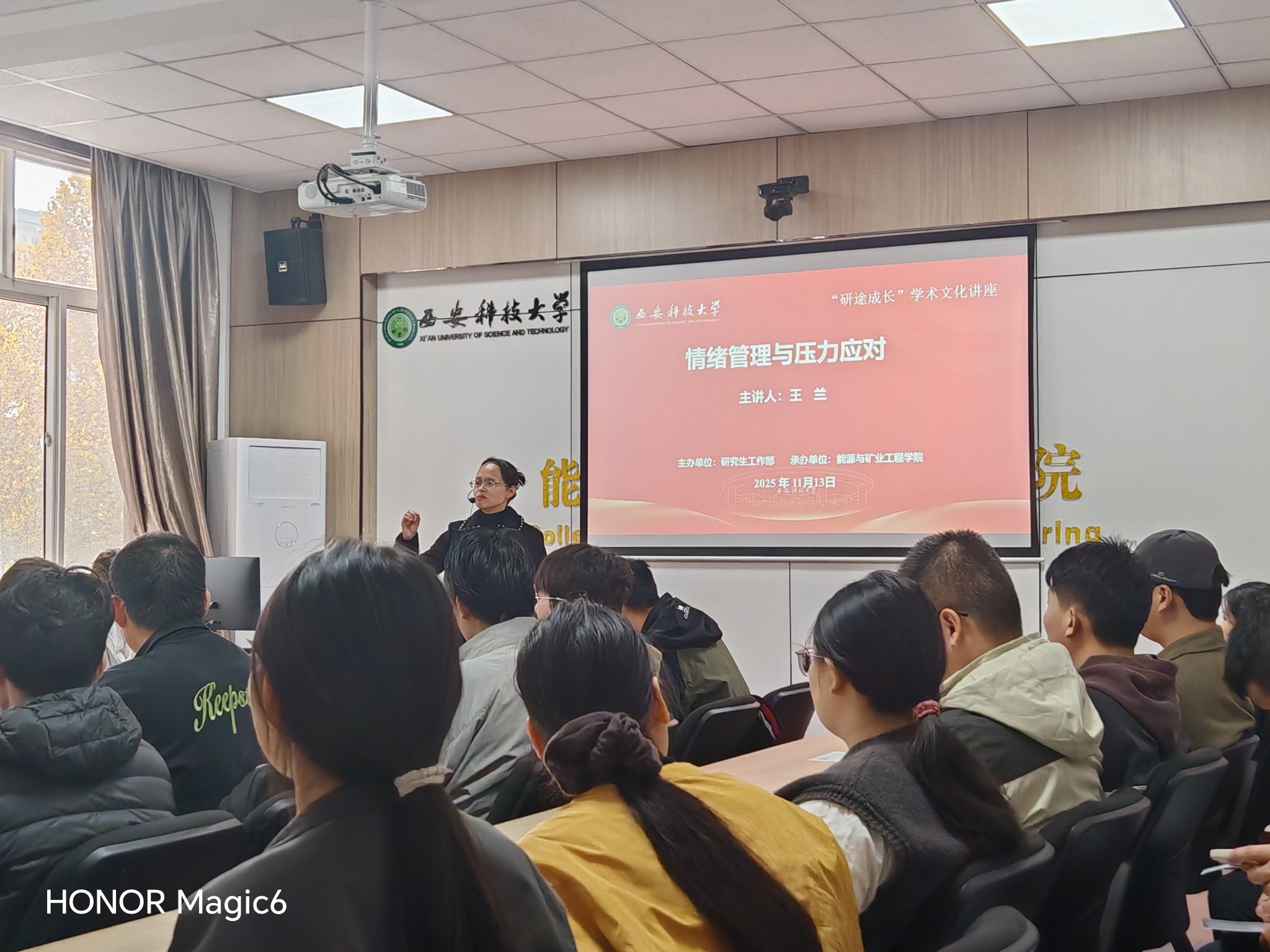 11月13日下午,在雁塔校区AC米兰中文2-310会议室,国家二级心理咨询师王兰应邀主讲《情绪管理与压力应对》为专题的“研途成长”系列学术文化讲座。讲座由研究生辅导员宋晓华主持,约80人参加了此次讲座。