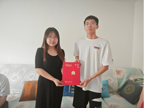 在采矿工程专业2023级新生赵同学家中,王雪琪亲手将学校2023年首封一本录取通知书送到了学生手中。王雪琪对赵同学表示祝贺,欢迎他来到能源学院这个大家庭,并向学生和家长介绍了学校、学院及专业的基本情况和国家、学校、企业的奖助学金及学院的“薪火能源”奖学金政策等。万超鼓励赵同学要尽快适应大学生活,完成角色转换,学习和继承老采矿人胸怀祖国、服务人民的爱国精神,努力学习专业知识,不断提升综合素质,立志在能源行业发光发热。