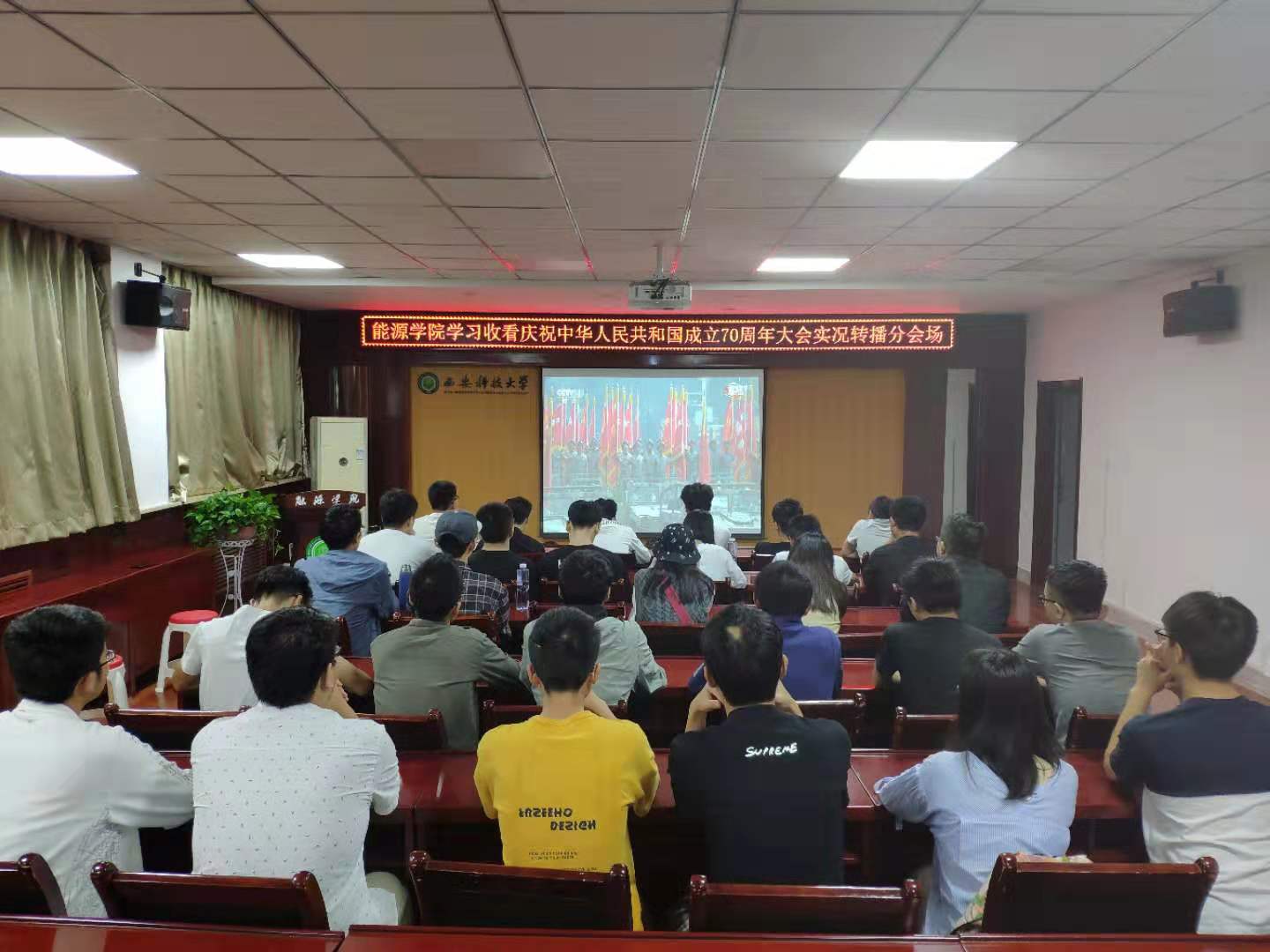 10月1日上午,庆祝中华人民共和国成立70周年大会在北京天安门广场隆重举行。中共中央总书记、国家主席、中央军委主席习近平发表重要讲话。能源学院组织学生通过不同方式收听收看了大会盛况,院团委副书记王雪琪带领学生代表在临潼校区骊山校园煤炭科技中心一楼报告厅观看了大会现场直播,同时,学院还组织学生在临潼校区学院会议室收看大会实况转播。会后,能源学子热议习近平总书记重要讲话,分享观看庆祝大会感想体会。