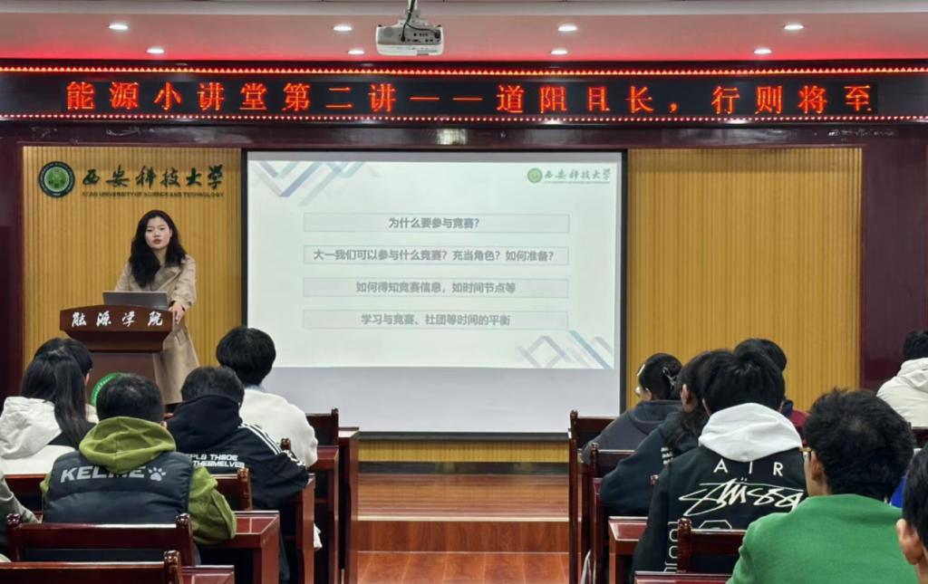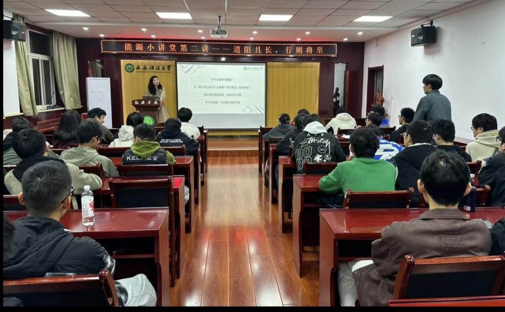 11月7日晚,能源小讲堂第二讲——“道阻且长,行且将至”交流会在临潼校区骊山校园学院会议室举办。建环2101班周振杰与23、24级部分同学进行了交流。