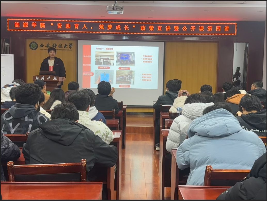 11月27日晚,能源学院2024年学业帮扶公开课第四讲在临潼校区骊山校园14教506举行。国家奖学金获得者、智采2201班郭天乐和各年级受资助学生代表50余人参加了活动。