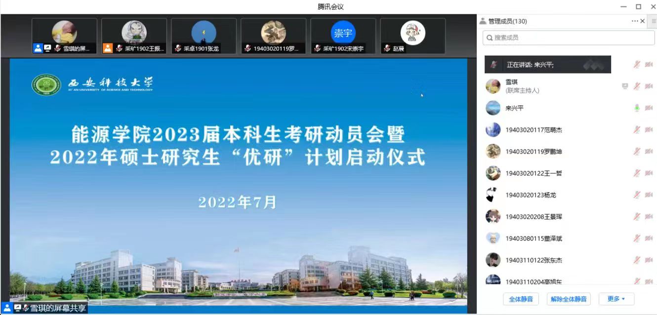 7月14日晚,我院2023届本科生考研动员暨“优研”计划启动仪式在线上举行,校长来兴平出席会议并讲话,学院党委书记陈吉兰、院长赵兵朝、副院长朱明,相关工作负责人、辅导员及2023届全体本科生参加了会议,会议由我院党委副书记党雪主持。