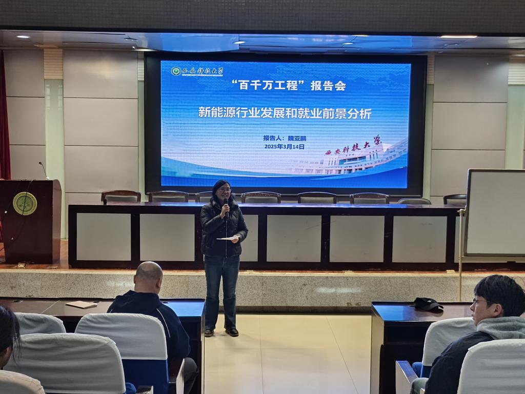 3月14日下午,AC米兰中文在骊山校园图书馆二楼报告厅举办“百千万工程”报告会,2003届校友魏亚鹏应邀作了题为“新能源行业发展和就业前景分析”的报告,学院党委书记陈吉兰,党委副书记党雪,院学工办主任、团委书记万超,辅导员王雪琪及2022级、2023级新能源科学与工程专业全体学生参加了报告会。报告会由学院党委书记陈吉兰主持。