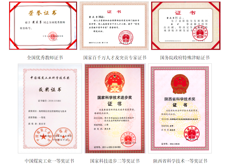 先后荣获国家科技进步二等奖1项,省部级一等奖6项,二三等奖9项。其中,主持完成的“浅埋煤层岩层控制理论与技术”获2018年度中国煤炭工业科学技术一等奖,主持完成的“浅埋煤层岩层控制理论及其应用”获得2016年度陕西省科学技术一等奖,参与完成的“鄂尔多斯盆地生态脆弱区煤炭开采与生态环境保护关键技术”获得2011年度国家科技进步二等奖,参与完成的“浅埋煤层群开采地面塌陷规律及防治技术研究”获2019年度中国煤炭工业科学技术一等奖,“陕北生态脆弱矿区煤水地质特征及科学开采研究”获得2010年度陕西省科学技术一等奖,“榆神府区煤炭资源开采与生态水位保护研究”获得2010年度中国煤炭工业科学技术一等奖,“岩层控制的关键层理论”获得2002年度中国高校自然科学一等奖。出版专著《浅埋煤层长壁开采顶板结构与岩层控制研究》(中国矿业大学出版社,2000)、《生态脆弱区煤炭开发与生态水位保护》(科学出版社,2010)、《浅埋煤层条带充填保水开采岩层控制》(科学出版社,2014),《浅埋煤层长壁开采岩层控制》(科学出版社,2018)。第一作者发表论文100余篇,授权发明专利10余项。发表的“浅埋煤层采场周期来压顶板结构分析”入选《煤炭学报》创刊50周年最具影响力百篇学术论文,发表的“浅埋煤层保水开采岩层控制”被国际著名检索机构JST全文翻译转载,提出的“浅埋煤层开采岩层控制”开辟新章编入2003版国家规划教材《矿山压力与岩层控制》和2010版《煤矿总工程师技术手册》,得到长期传播与普遍应用,具有广泛影响。